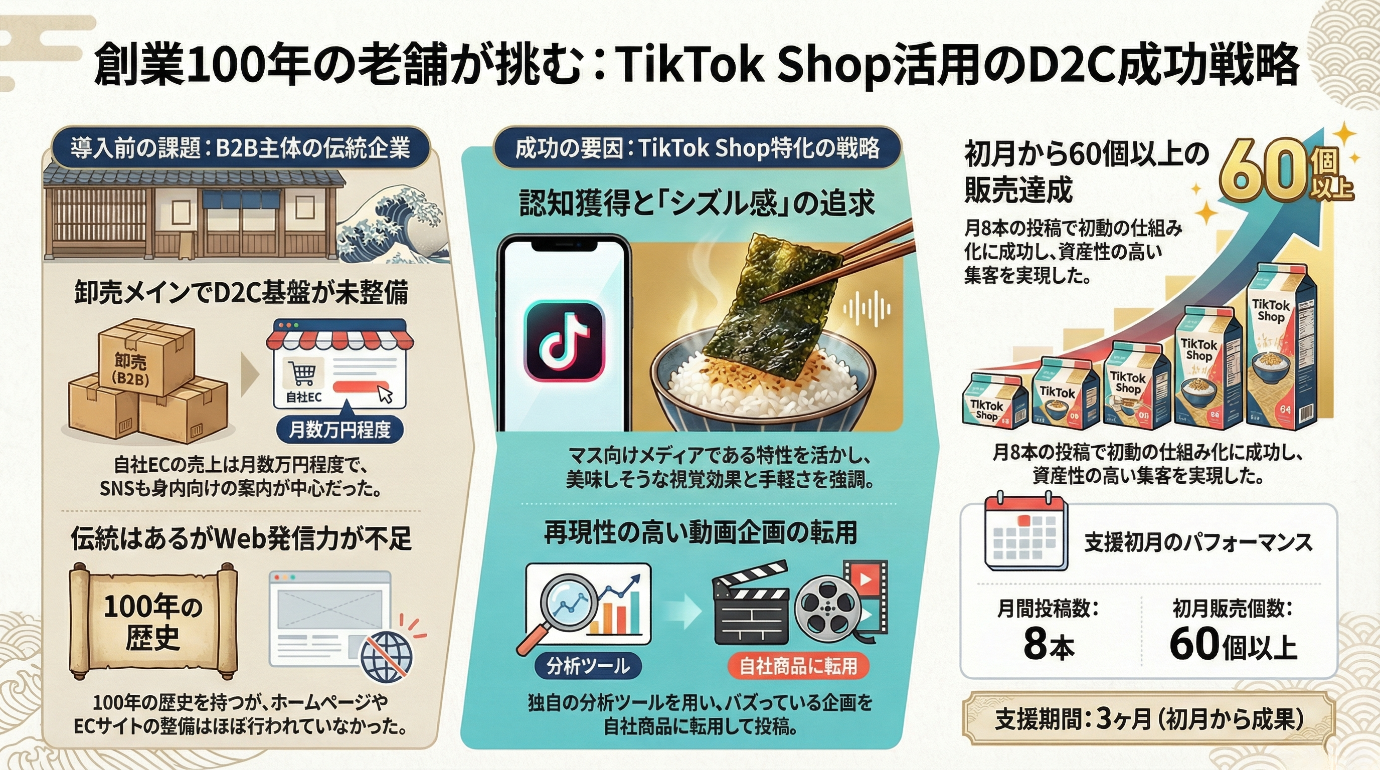 今回のヤマキいとう様との取り組みにおける、具体的な運用スキームや分析のポイントをまとめた特別資料を配布いたします。資料タイトル: 「100年続く老舗がTikTokショップで初月から成果を出した3つの秘策」