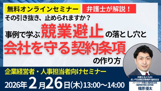 今回、弁護士法人TLEO虎ノ門法律経済事務所では、「その引き抜き、止められますか?事例で学ぶ『競業避止』の落とし穴と、会社を守る契約条項の作り方」をテーマにセミナーを実施いたします。