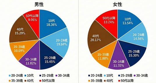 男性の美容医療は若年層に集中しており、24歳以下の比率は女性より約10%高くなっています。SNSなどを通じて施術情報に触れる機会が多く、美容医療を身近な選択肢として捉える傾向があります。