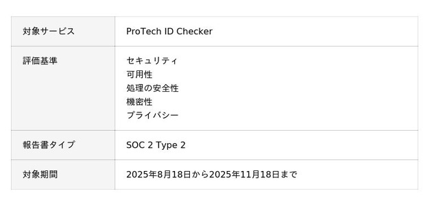 当社は、今回のSOC 2 Type 2取得を契機に、情報セキュリティおよび内部統制のさらなる高度化に継続的に取り組んでまいります。今後も法令・ガイドラインへの対応にとどまらず、日々の運用において信頼性の高いサービス提供を実現することで、お客様の安心・安全な事業運営を支援してまいります。トータル本人確認(tKYC)ツール「ProTech ID Checker」