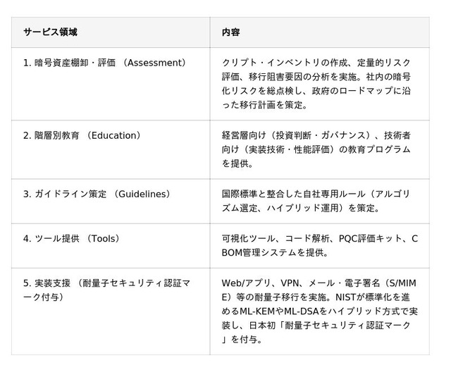 本サービスは、当協会の厳格な基準に基づく日本初の「耐量子セキュリティ認証マーク」付与を含め、暗号資産の棚卸・評価から実装支援、教育・ガイドライン策定まで、企業の重要資産を「将来の解読」から守るための包括的な移行支援を提供いたします。
