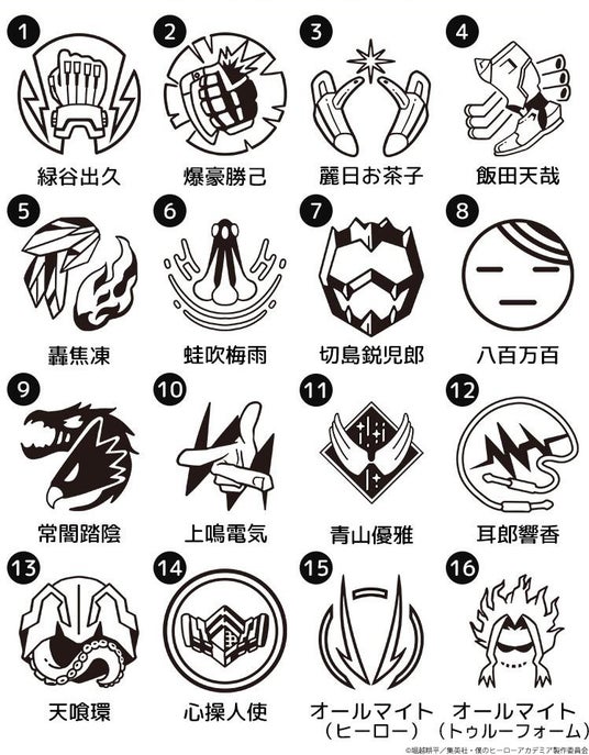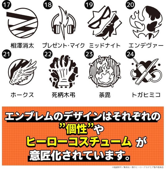 エンブレムのデザインは、緑谷出久や爆豪勝己、麗日お茶子、轟焦凍に、オールマイト、相澤消太、エンデヴァー、ホークス、死柄木弔や荼毘、トガヒミコなど24種類。マークをみればそのキャラクターが彷彿とされるようなデザインになっています。