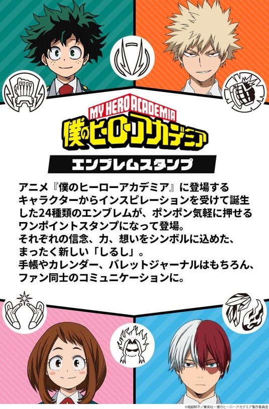 「僕のヒーローアカデミア エンブレムスタンプ」は、ヒーローの“個性”やコスチュームをモチーフに、紋章のようなマークに意匠化した公式ライセンス商品となるスタンプ。