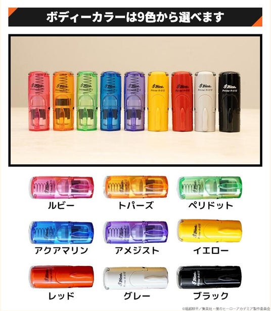 ボディーカラーはこちらの全9色。キャラクターのイメージカラーで選ぶこともできます。なおインク色は黒になります。
