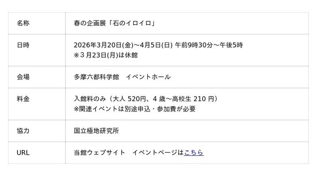 多摩六都科学館(東京都西東京市、館長:高柳雄一)では2026年3月20日(金)~4月5日(日)まで、春の企画展「石のイロイロ」を開催します。
