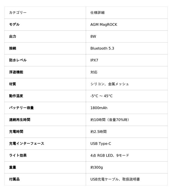 革新的な磁石吸着デザインに加え、AGM MagROCKはIPX7防水と浮遊機能、頑丈なボディ構造、最大10時間の連続再生時間を兼ね備えており、日常生活からアウトドアアドベンチャーまで、あらゆる使用シーンにおいて、より自由で信頼性の高い携帯エンターテインメントを提供します。