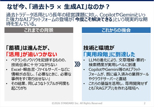 大手企業を中心に1,500社以上のデジタルトランスフォーメーション(以下「DX」)の推進と内製化を支援する株式会社STANDARD(本社:東京都港区、代表取締役社長:伊藤海、以下「当社」)は、DX推進に取り組まれる企業様に向けて「生成AIが駆動する ”過去トラブルデータ”の循環」を無料公開いたしましたので、お知らせいたします。