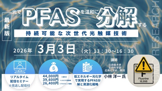 PFAS(有機フッ素化合物)の残留性と有害性は、世界的に深刻な環境・産業課題となっています。従来は活性炭などへの吸着によって除去してきましたが、高濃度PFASを含む廃棄物の処理には、エネルギー負荷やコスト、持続可能性、二次汚染など多くの問題が残されています。また、現行の分解技術は強固なC-F結合を切断するために高温・高エネルギーを要し、副生成物の制御にも課題があります。本セミナーでは、これらの課題に対する新たな解決策として、半導体ナノ結晶を利用した温和な光分解技術を紹介し、光化学的アプローチによるPFAS分解の可能性を解説します。光による酸化・還元反応の基礎、半導体ナノ結晶の電子特性、非線形光反応を含む光化学的メカニズムを概説し、低エネルギーでPFASを分解する戦略と具体的な事例を紹介します。さらに、光分解で得られる生成物の扱いとリサイクル利用の可能性にも触れ、環境負荷を抑えた持続可能なPFAS処理技術の将来像を示します。