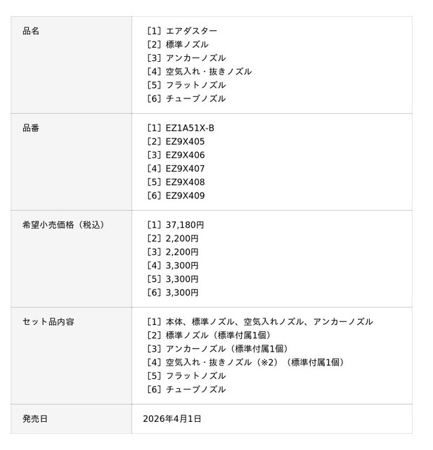 パナソニック株式会社 エレクトリックワークス社(以下、パナソニック)は、電動工具ブランド「EXENA(エグゼナ)」から「エアダスター」を2026年4月1日に発売します。電設盤内の細かいホコリの吹き飛ばしや、コンクリートへの穴あけ後の下穴清掃などに使用できます。また、浮き輪の空気入れ・抜きなどにも使用可能な製品です。