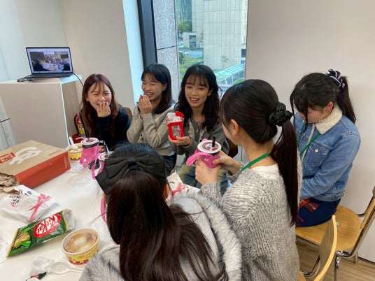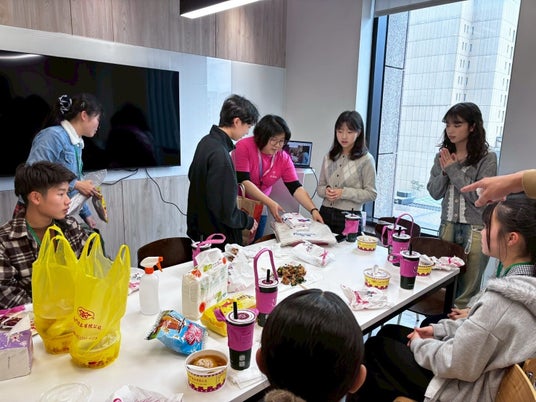 国は違えどやはり、話題はスイーツ。台湾学生、福岡学生が盛り上がる一幕