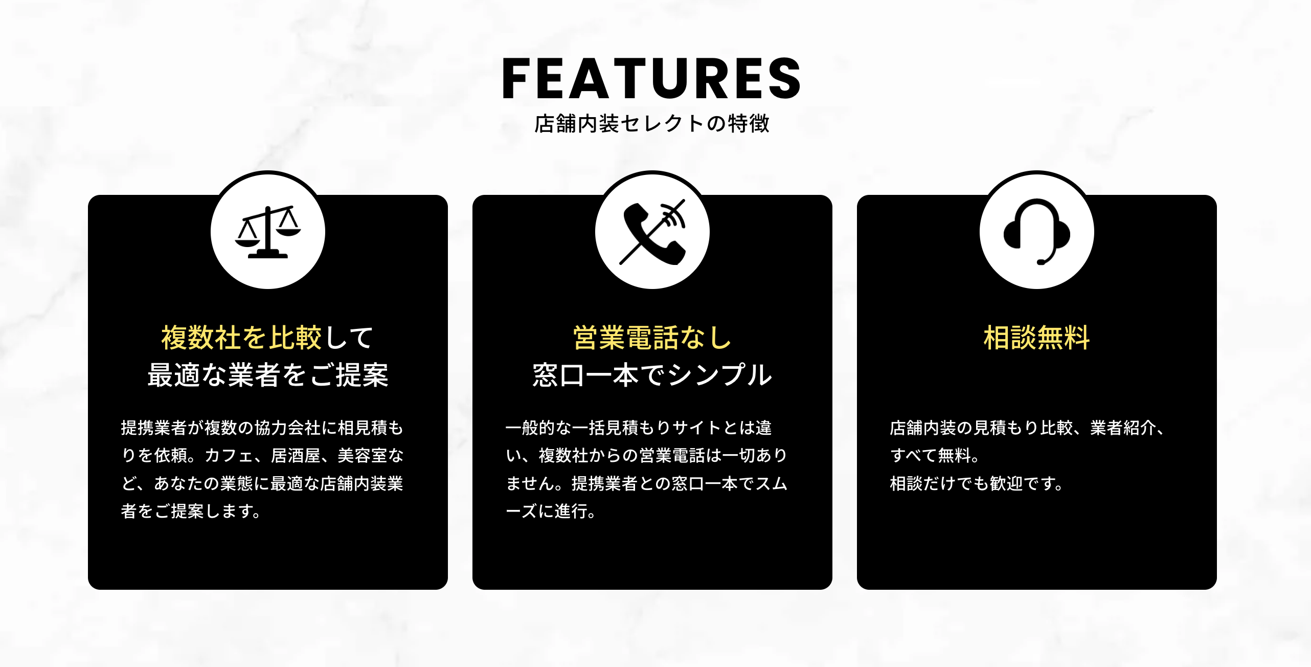 「どこに頼めばいいか分からず、信頼面も不安。」「比較の時間がなく、営業電話も増やしたくない。」などといった店舗内装に関するお悩みに対して、提携業者が複数社に相見積もりを取り、最適な業者をご提案します。