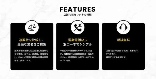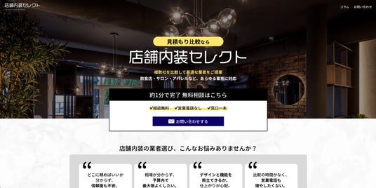 『店舗内装セレクト』は、飲食店やサロン・アパレルなどあらゆる業態に対応、店舗内装に関する最適な業者をご提案し、見積もりを比較できるサイトです。