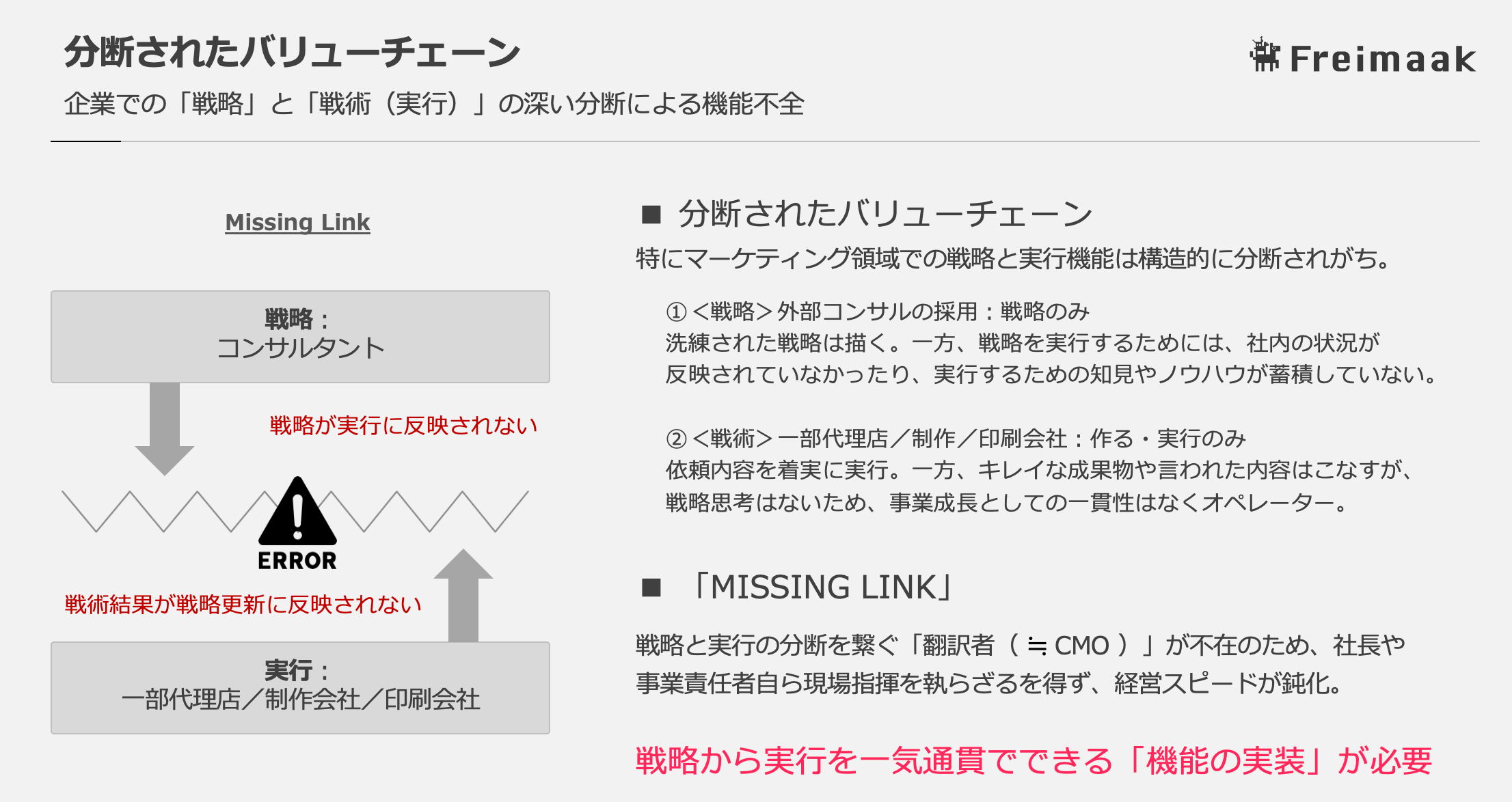 Freimaakは、助言のみのコンサルティングや指示待ちの制作会社ではなく、企業の「右腕機能」そのものとなり、「再現性のある」戦略と実行プロセスを企業内に実装。持たない経営による「戦略的勝利」を実現します。