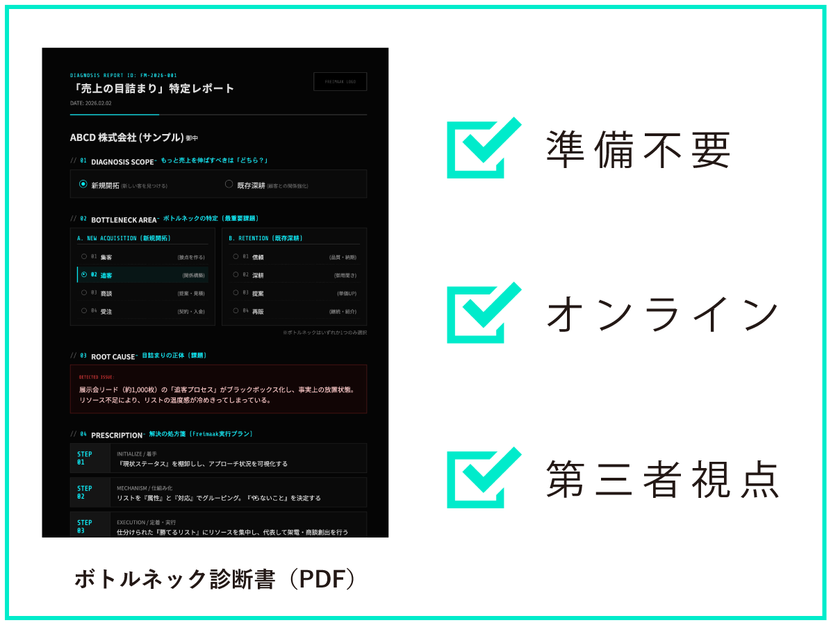 丸投げではなく、自社の構造変革を共に志す「熱意ある経営者・事業責任者様」。【ボトルネック診断のご予約・詳細】