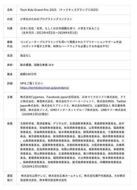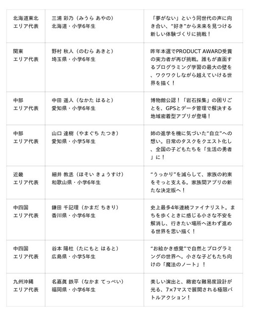子ども向けプログラミング教育事業を行う株式会社CA Tech Kids(読み:シーエーテックキッズ、本社:東京都渋谷区、代表取締役社長:上野朝大)と株式会社テレビ朝日(本社:東京都港区、代表取締役社長:西 新、以下テレビ朝日)は、共催する日本No.1小学生プログラマーを決定するプログラミングコンテスト「Tech Kids Grand Prix 2025」(読み:テックキッズグランプリ2025)において、2026年2月28日(土)に開催する本選決勝プレゼンテーションに進出するファイナリスト8名を決定いたしました。