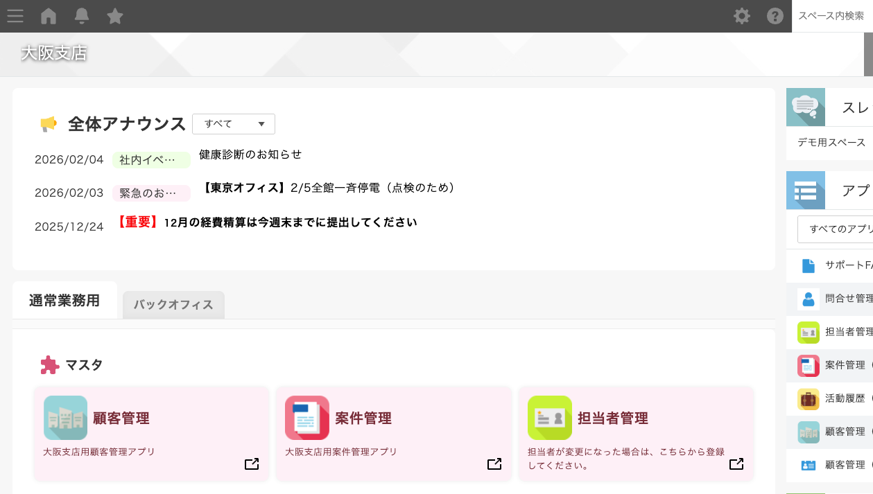 部署やチーム単位で、kintoneスペースごとにポータル画面のレイアウトや表示内容を自在にカスタマイズできます。