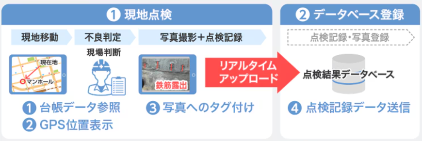 ドローンによる点検データのAI解析や、GIS連携管理台帳※3でのデータ一元管理と点検票の自動作成などの技術を組み合わせた、一気通貫の点検・診断・管理に関する実証を行います。