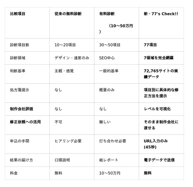 従来の診断は「自社サイトの問題点」を指摘するだけでした。『新・77's Check!!』は、その問題点が「制作会社の能力不足」に起因するのかまで明らかにします。