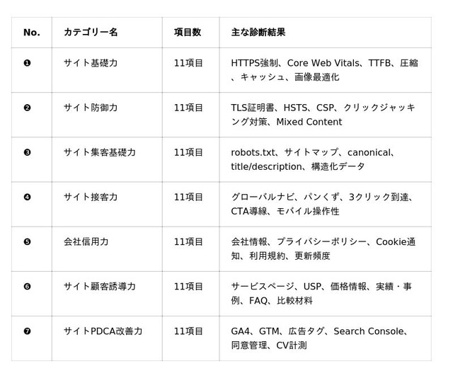 本診断は、従来の「見た目・流行・制作側の自己満足」に偏りがちなホームページ診断とは一線を画し、「集客」「問い合わせ」「売上」につながる『勝てる資格』が備わっているかを77項目・7カテゴリーで検証します。