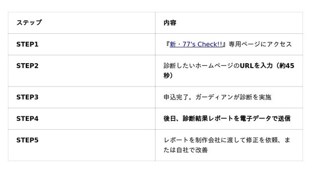 株式会社ガーディアン(本社:東京都中央区京橋3-9-5/代表取締役社長:青山裕一)は、日本全国の中小企業経営者・個人事業主を対象に、無料ホームページ診断サービス『新・77's Check!!』の提供を開始いたします。