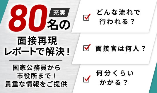これまで多くの受験生の方々が実際に体験した面接での様々な「貴重な情報・生の声」を余すことなく合格者の面接再現レポートにて公開しております!その数80名超え!自治体も国家公務員から市役所まで様々です。