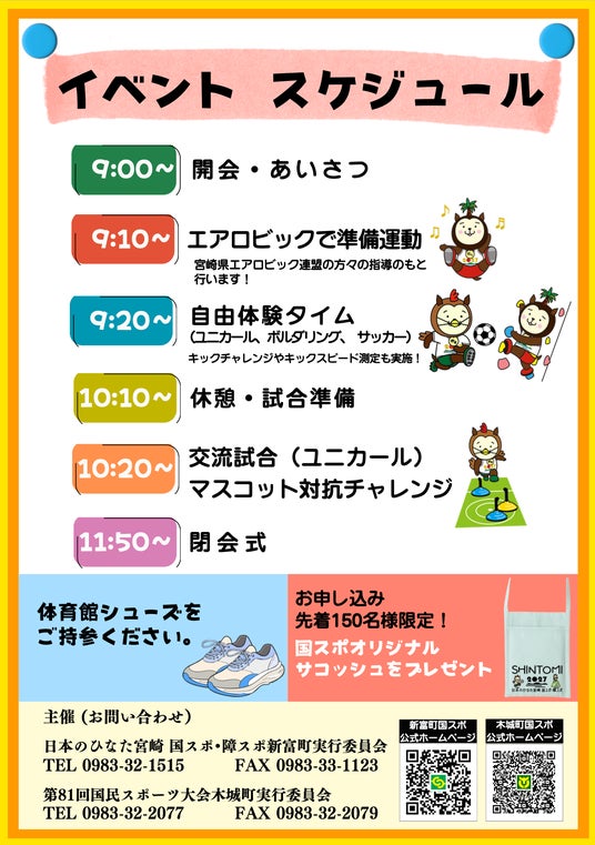 当日は、国スポ競技を「見て・やって・楽しむ」体験型イベントをご用意!新富町ではサッカー・ユニカール、木城町ではボルダリング・エアロビックを体験できます。