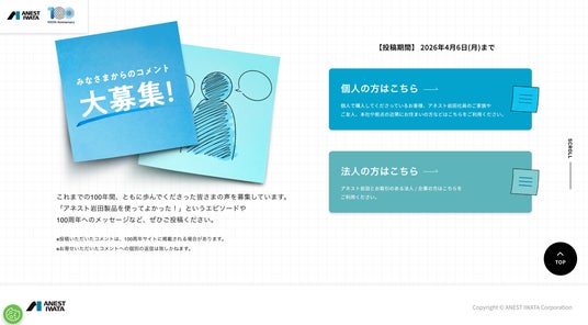 アネスト岩田株式会社(本社:神奈川県横浜市、代表取締役 社長執行役員:三好 栄祐、以下、アネスト岩田)は、2026年5月に創業100周年を迎えるにあたり、2月6日(金)に記念サイトを公開しました。