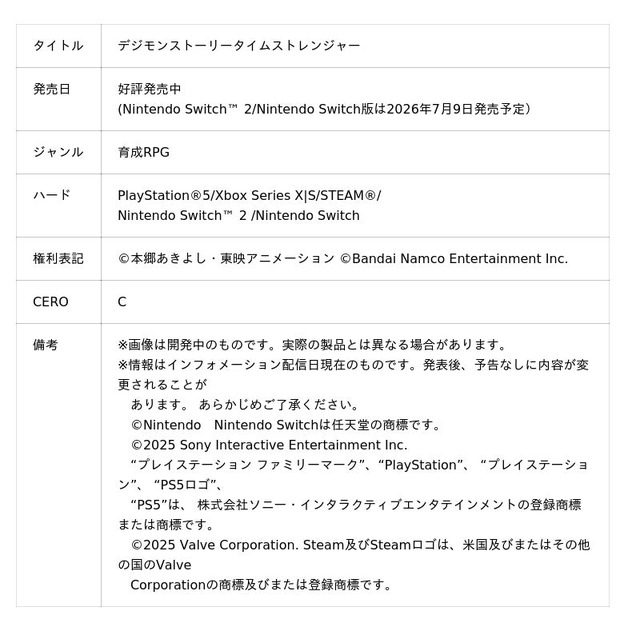 株式会社バンダイナムコエンターテインメントは、PlayStation(R)5/Xbox Series X|S/STEAM(R)でシリーズ最速累計出荷本数100万本を突破した育成RPG「デジモンストーリー タイムストレンジャー」において、Nintendo Switch(TM)2 /Nintendo Switch(TM)版を2026年7月9日に発売することを発表いたしました。