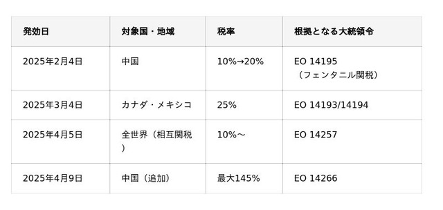 2025年2月以降、トランプ大統領はIEEPAに基づき、以下の関税を発動しました。