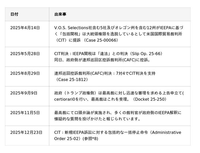 IEEPA関税の適法性を巡っては、V.O.S. Selections社などが早期から提訴し、現在最高裁での判断が待たれています。(参照*7)