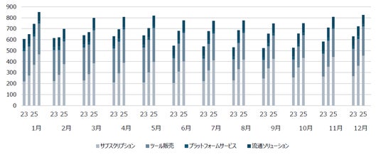 サブスクリプションは、CLIP STUDIO PAINT サブスクリプションモデルの売上です。ツール販売には、買い切りモデルや法人向けライセンスの売上などが含まれます。プラットフォームサービスには、CLIP STUDIO WEBサービスでの売上等が含まれます。流通ソリューションには、電子書籍及びDC3に関連する売上が含まれます。