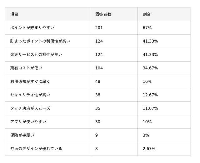 - 楽天カードを利用して感じた良い点TOP3は「ポイントが貯まりやすい」「貯まったポイントの利便性が高い」「楽天サービスとの相性が良い」。
