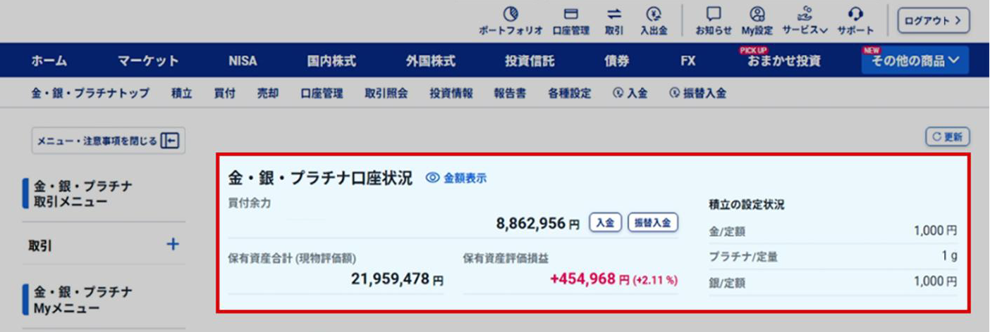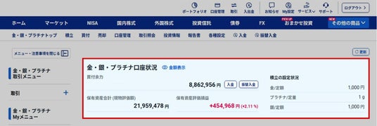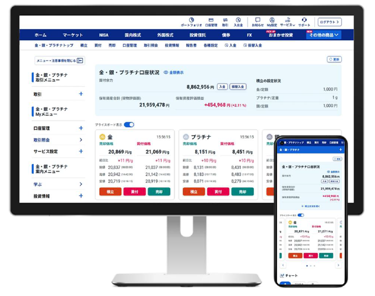 金・銀・プラチナ取引ページをメインサイトに統合することで、株式・投信など他の商品と同様の操作感でスムーズにご利用いただけるようになりました。