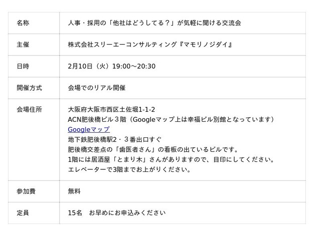 中小企業の守備力を強くするメディア『マモリノジダイ』を運営する株式会社スリーエーコンサルティング(代表取締役社長:竹嶋 寛人)は、2026年2月10日(火)19:00より、大阪・肥後橋にて無料イベント「人事・採用の『他社はどうしてる?』が気軽に聞ける交流会」を開催します。今回のテーマは、「採用サイト、求人票、求人要項」です。