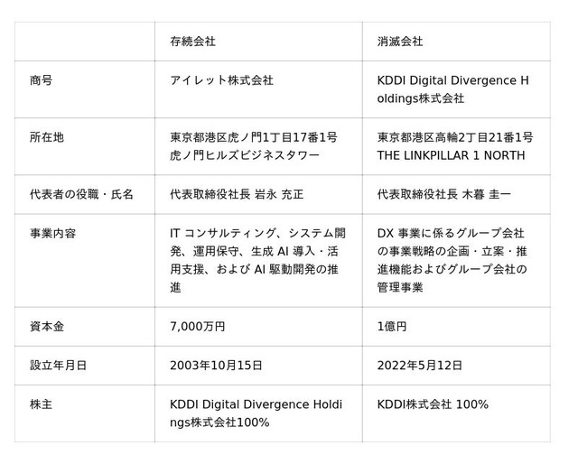 KDDI Digital Divergence 傘下のグループ会社各社の株式は、存続会社であるアイレット株式会社へ