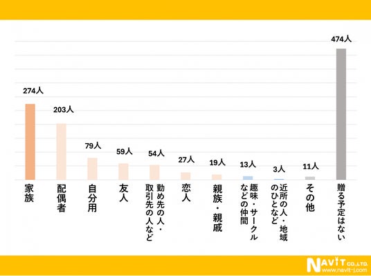 2026年のバレンタインお菓子を贈る人についてのアンケートを複数回答でいただきました。一番多かったのが「家族」で274人、次に多かったのが「配偶者」で203人で「自分用」と回答された人が79人と続きました。