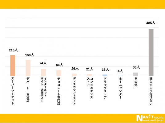 バレンタインに贈るお菓子をどこで購入するかというアンケートです。「スーパーマーケット」が一番多く215人、「デパート・百貨店」が168人、3番目に「インターネットサイト・通販サイト」が74人という結果になりました。