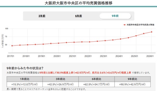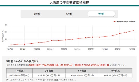 2. 2026年1月時点の大阪府全体の平均売買平米単価は9年前比で66.3%程度上昇し、継続的に右肩上がりの傾向