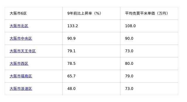 大阪市24区における9年前との上昇率をランキング形式で紹介します。9年間で各エリアがどのように変動してきたのかを可視化しました。価格の上昇率は売買を検討する際の重要な指標であり、マンションナビでは月次でデータを更新しています。