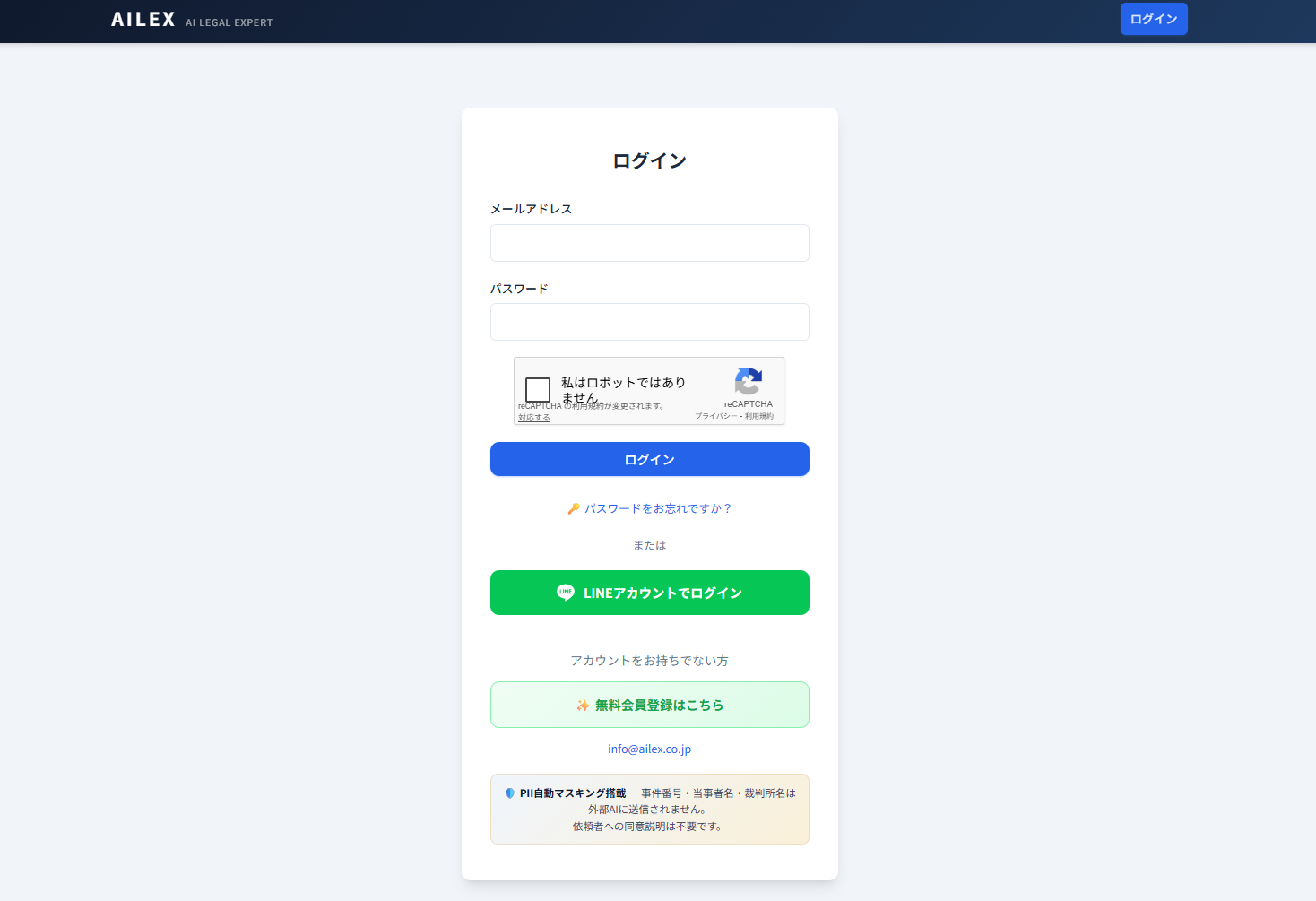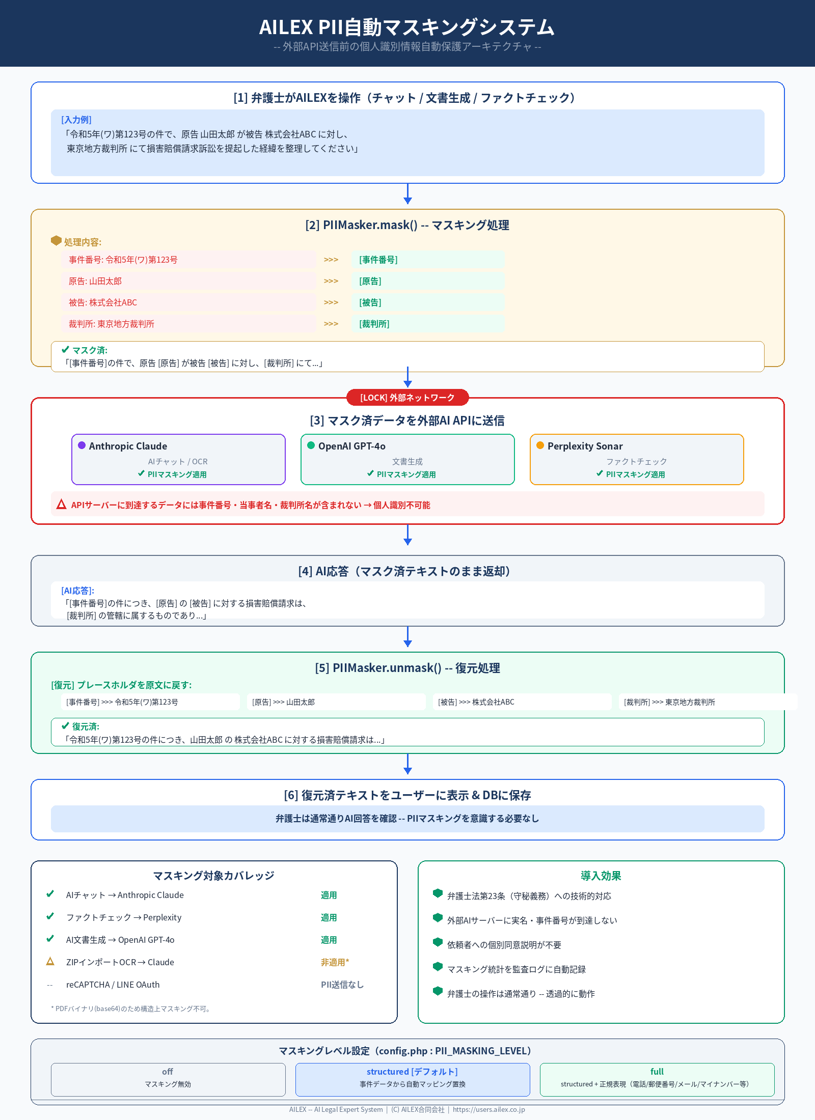 AILEXは独自開発のPIIマスキングエンジンを搭載し、事件番号・当事者名・裁判所名等の個人識別情報を、外部API送信前に自動的にプレースホルダーに置換します。