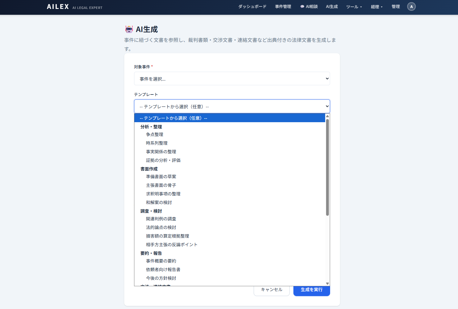 - AI文書生成(27種類の法律文書テンプレート)