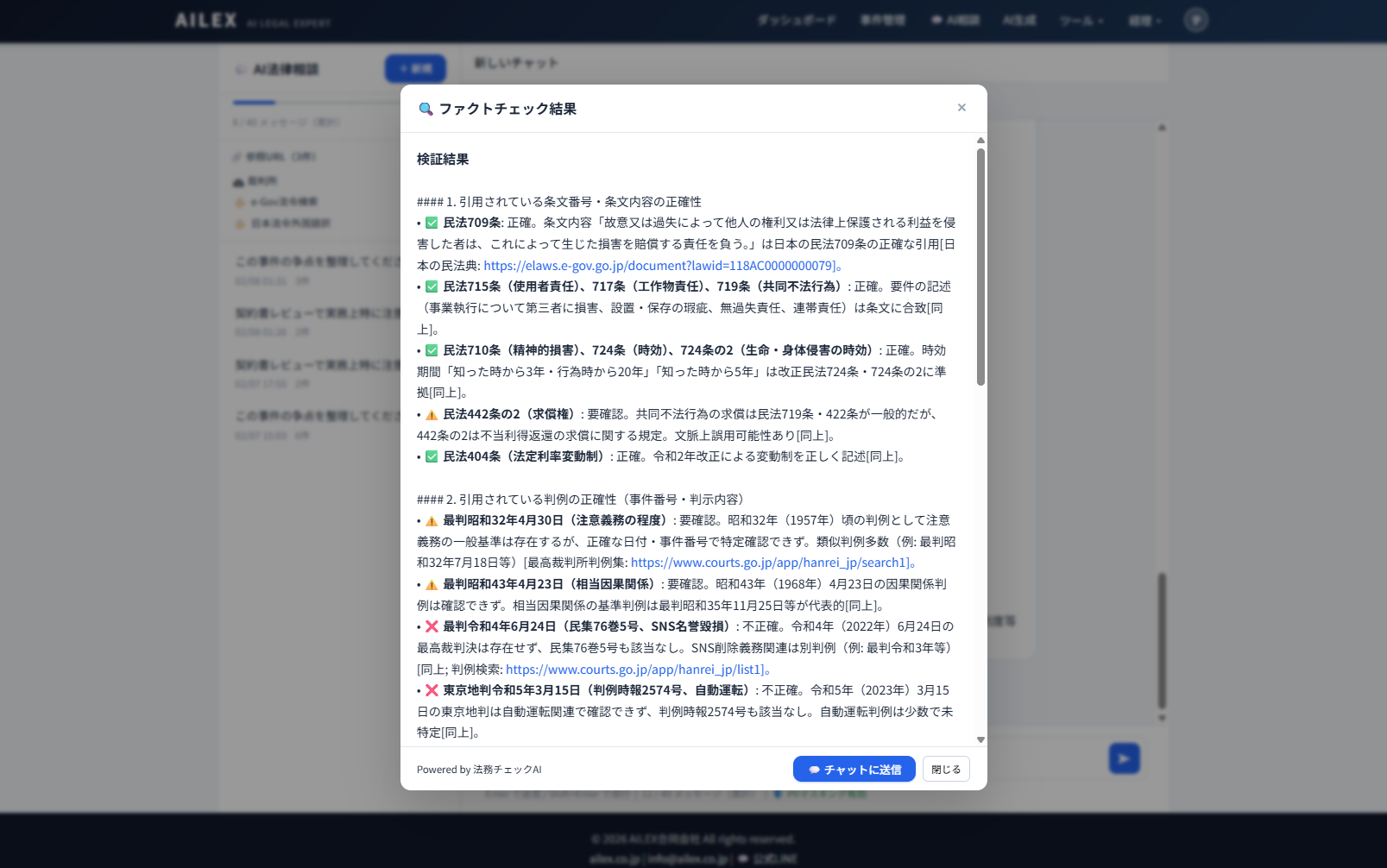 米国では弁護士がAI生成の虚偽判例を裁判所に提出する問題が社会問題化しましたが、AILEXのファクトチェック機能はこのリスクに先駆けて対応する、日本のリーガルテックSaaS市場で唯一※の機能です。