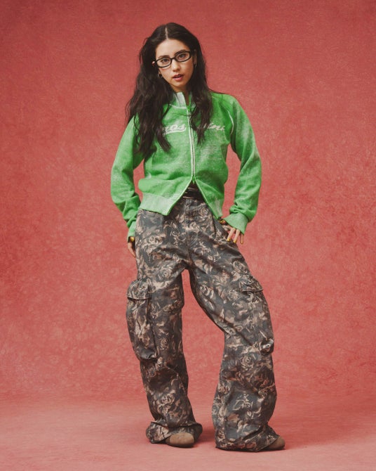 提案するスタイリングには、フェミニンな要素をミリタリーやワーク由来の無骨なシルエットに掛け合わせることで、「atmos pink」ならではのコントラストを表現。ケーブル編みのニットトップスにカーゴディテールを効かせたレイヤードスカートを合わせています。また、デニムのセットアップには、バンダナパターンを大胆にパネル使いし、ストリートの空気感とクラフト的な表情を融合。ショート丈のジャケットとワイドシルエットのボトムスによるメリハリのあるバランスは、強さと女性らしい柔らかさを併せ持つスタイルに仕上がります。