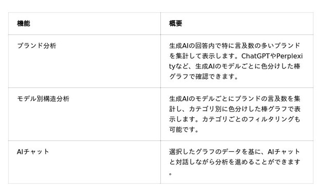 本機能により、ブランドのプレゼンス(存在感)や評価構造を生成AIのモデル別・カテゴリ別に明らかにし、戦略策定に活かすことができます。