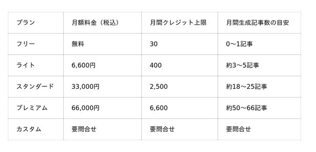 magicss v2はクレジット制を採用しており、初期費用無料・1か月単位の契約でご利用いただけます。フリープランではカード登録不要で約1記事分の生成を無料体験可能です。