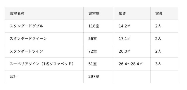 客室は全4タイプ・297室に刷新し、ビジネスから観光までさまざまな滞在シーンに対応できる客室構成といたします。 既存の2室を1室に再構成し、グループやファミリーでのご利用にも適した最大3名まで宿泊可能な客室を8室から51室へ大幅に増設します。また、全客室の内装・家具・備品を刷新することに加えて、水回り設備も全室で一新し、機能性と清潔感を向上いたします。