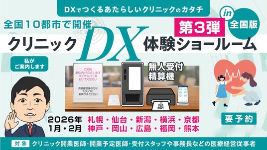 株式会社日本経営(本社:大阪府豊中市、代表取締役社長:橋本 竜也、以下 日本経営)は、クリニックのDX推進をテーマとした体験型イベント「クリニックDX体験ショールーム 第3弾」を、2026年1月から2月にかけて全国10都市で開催します。本イベントでは、日本経営とソフトバンクグループのSB C&S株式会社が開発を進めている、無人受付・精算機について、診療所向け情報発信で知られるYouTubeチャンネル「Wevery! チャンネル」でおなじみの河村伸哉とともに、実際に操作しながら体験いただけます。