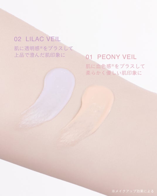 今回登場するのは、毎日のメイクがより楽しくなるような"ちゅるツヤ肌"に仕上げてくれる化粧下地「サンリットヴェール プライマー」。スキンケア感覚で使えるみずみずしいテクスチャーが特徴で、きしみ感なく肌にすっとなじみ、光のヴェールをまとったような内側から輝くきれいなツヤ感を長時間キープ※1 してくれます。カラーはなりたい肌印象にあわせて選べる 2 色展開。「01 ピオニーヴェール」はミルキーなピンクカラーが肌に血色感※2 を、「02 ライラックヴェール」はやわらかいパープルカラーが肌に透明感※2 をプラス。どちらのカラーも白浮きせず、肌を自然に明るく澄んだ印象に整えてくれます。また吸収剤不使用のノンケミカル処方&せっけんでオフしやすい処方も魅力。テクニック入らずで誰でも簡単にツヤ肌に仕上がる「tilnus」の新作プライマーで、多幸感あふれる "ちゅるツヤ肌"メイクをぜひ楽しんでください。