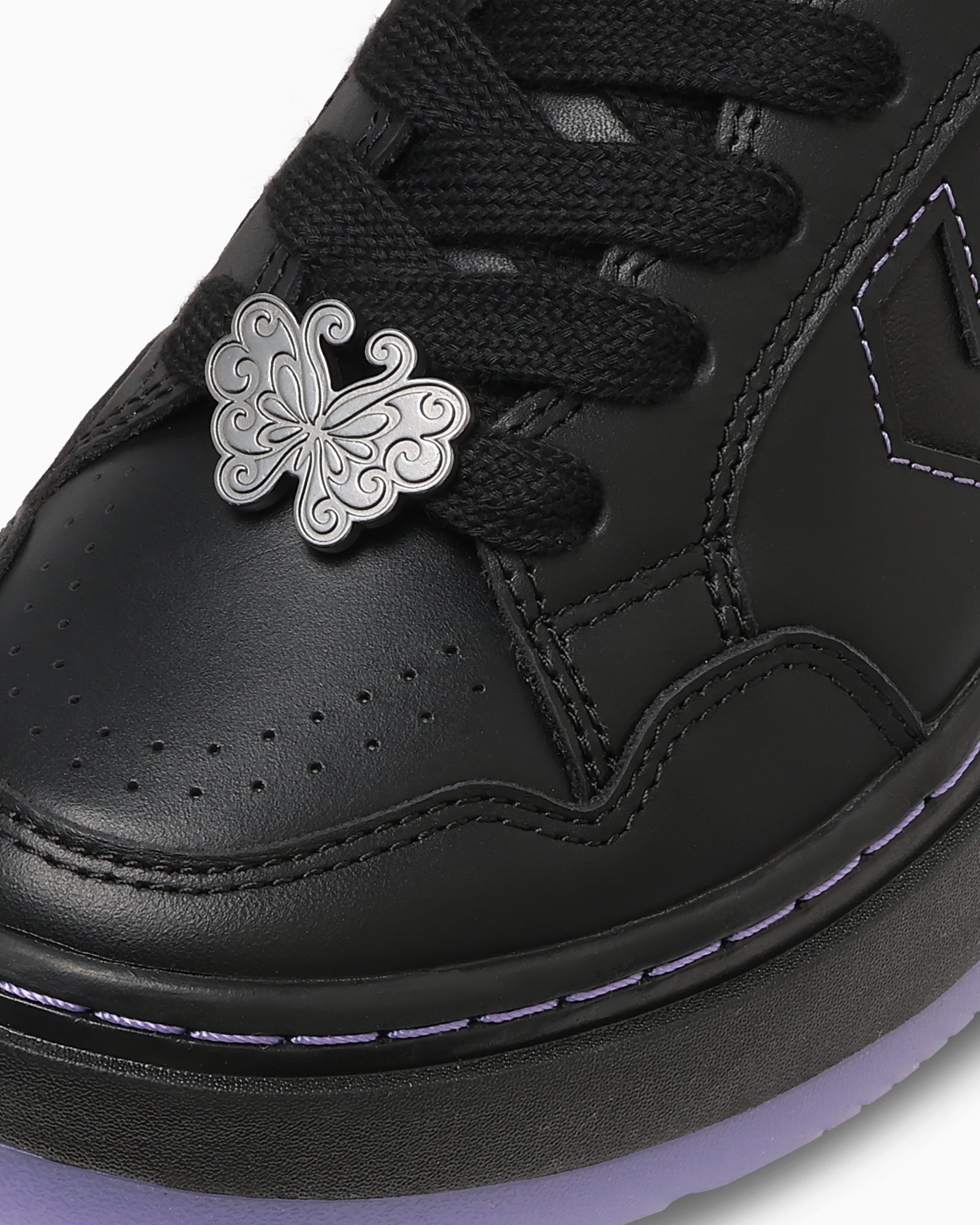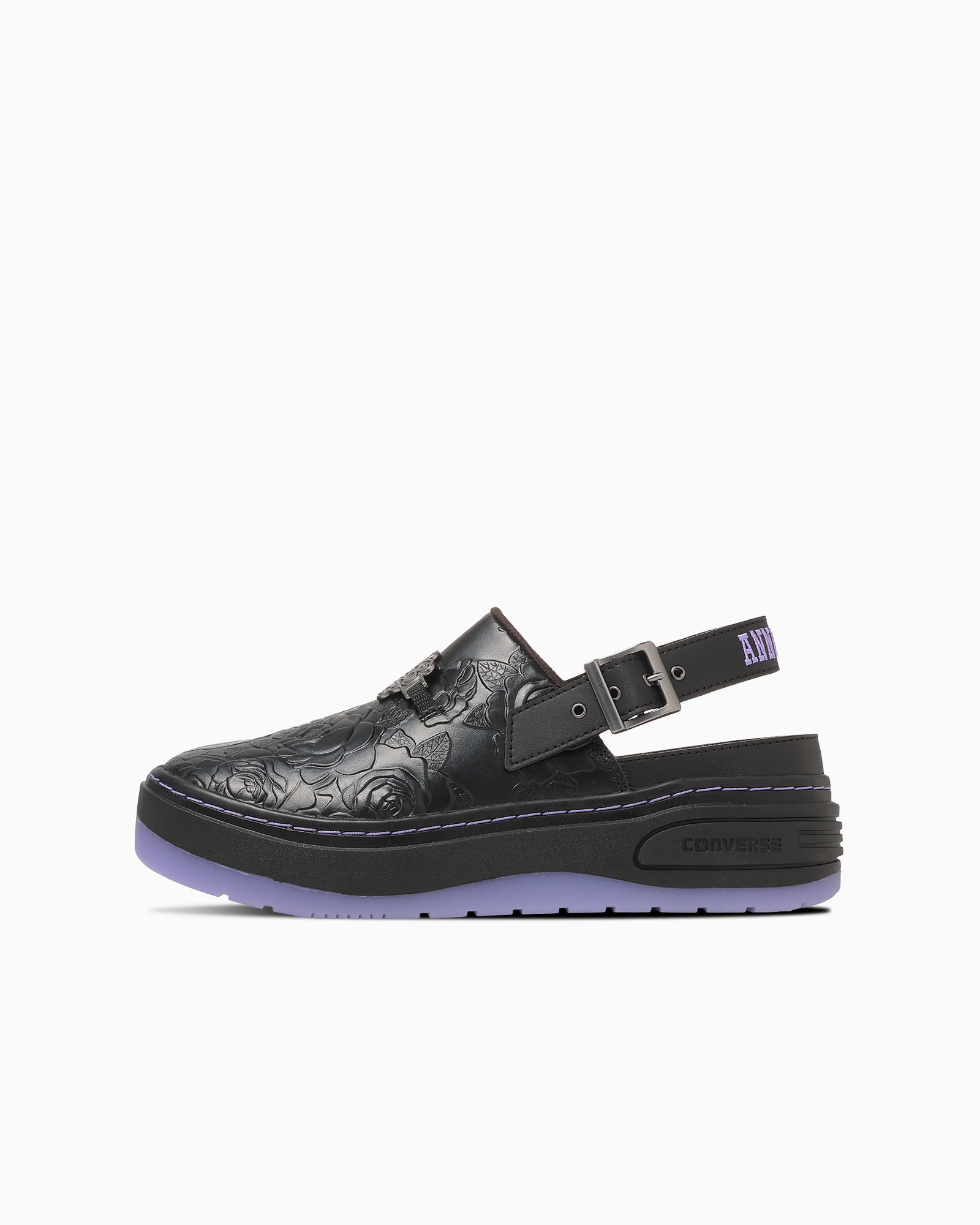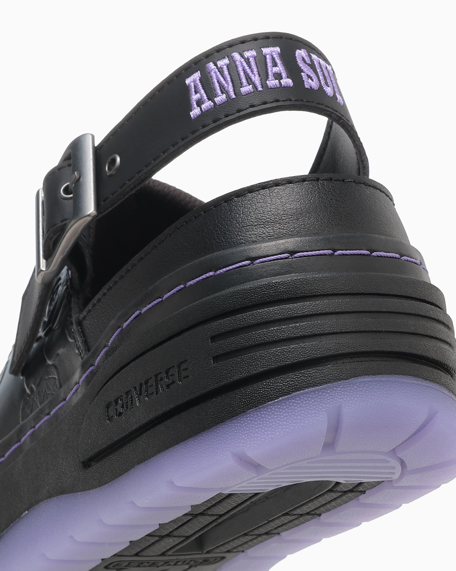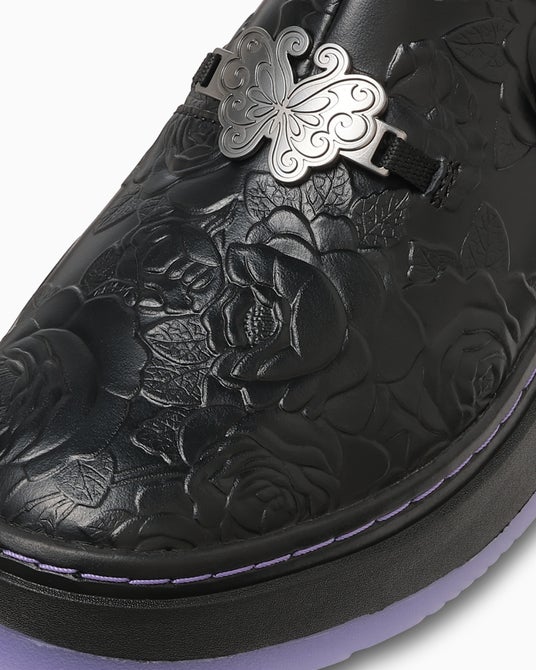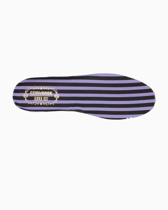 ANNA SUIのイメージカラーでもあるブラック/パープルのカラーリングでまとめ、ブランドのアイコンである蝶や薔薇のモチーフを取り入れました。インソールにはANNA SUIカラーのストライプ柄にダブルネームプリントを施しています。オリジナルのカートン入りです。また、アウトソールにはE.V.A.とラバーを組み合わせることで厚底ながら軽量化を実現しています。