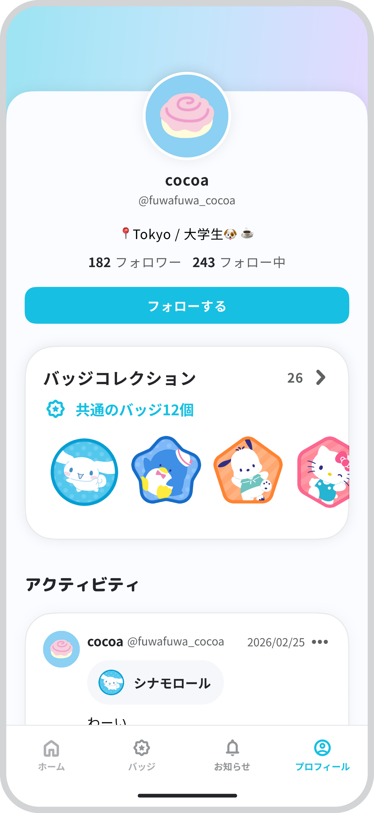 友人や同じバッジを持つユーザー同士でフォローし合い、お互いの思い出を気軽にシェア。